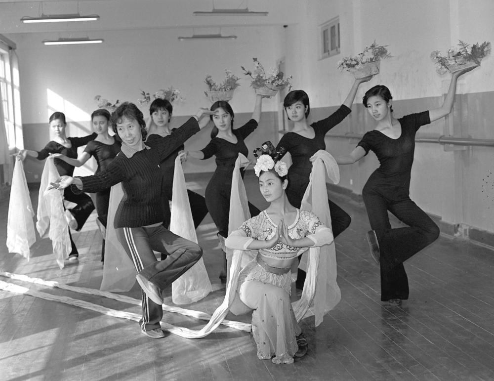 高金荣(前左)正在辅导学员排练组舞《敦煌梦幻》(1985年12月27日摄)。新华社记者 张生贵 摄