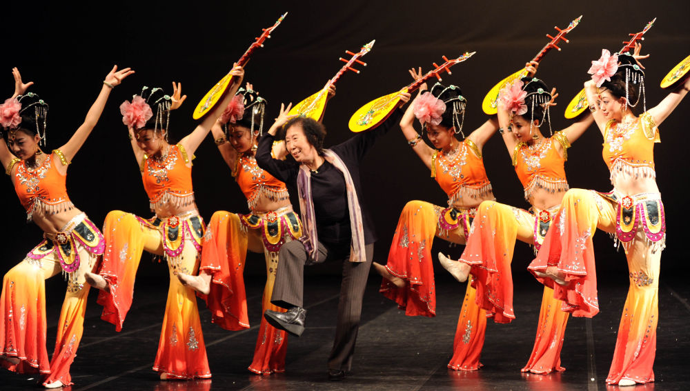 高金荣与《飞天》的演员们一起表演敦煌舞。新华社发