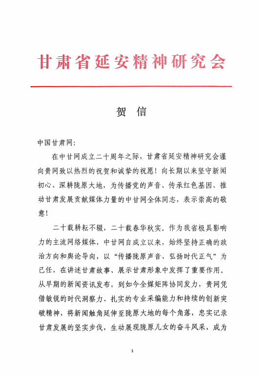 中国甘肃网12月22日讯(西北角·中国甘肃网记者 刘姗)值中国甘肃网成立二十周年之际,甘肃省延安精神研究会向中国甘肃网发来贺函,致以热烈祝贺与诚挚祝愿。