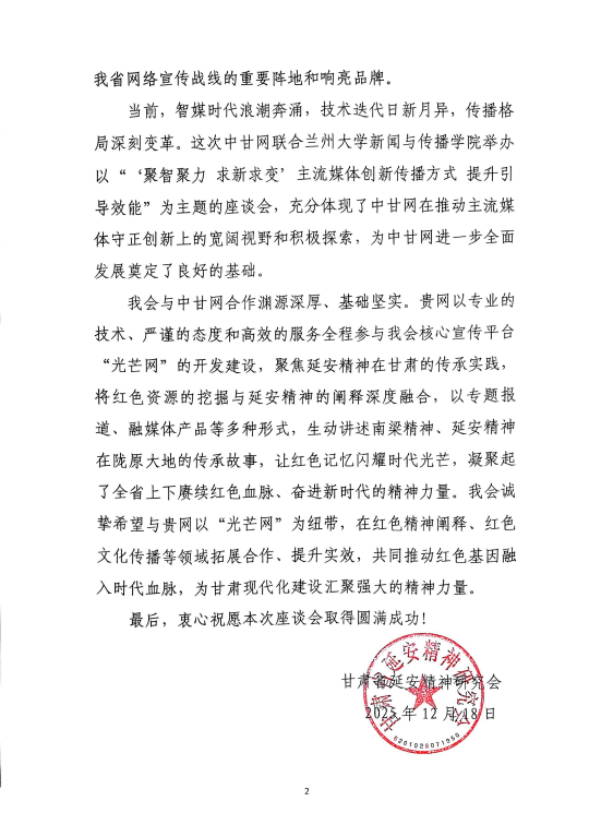 甘肃省延安精神研究会诚挚希望以“光芒网”为纽带,与中甘网在红色精神阐释、红色文化传播等领域拓展合作,提升实效,共同推动红色基因融入时代血脉,为甘肃现代化建设汇聚强大精神力量。