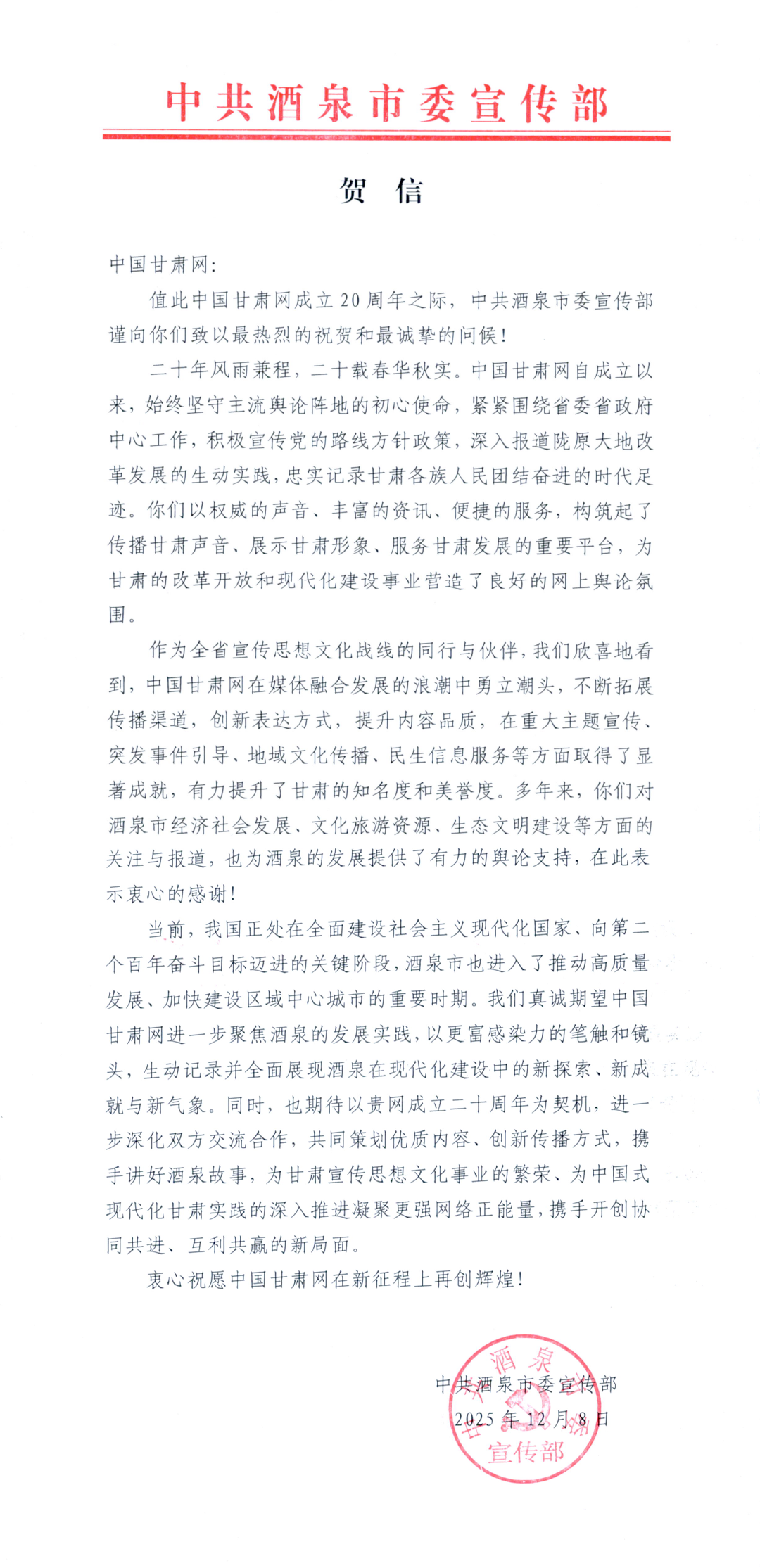 二十载·正青春丨酒泉市委宣传部祝贺中国甘肃网成立20周年