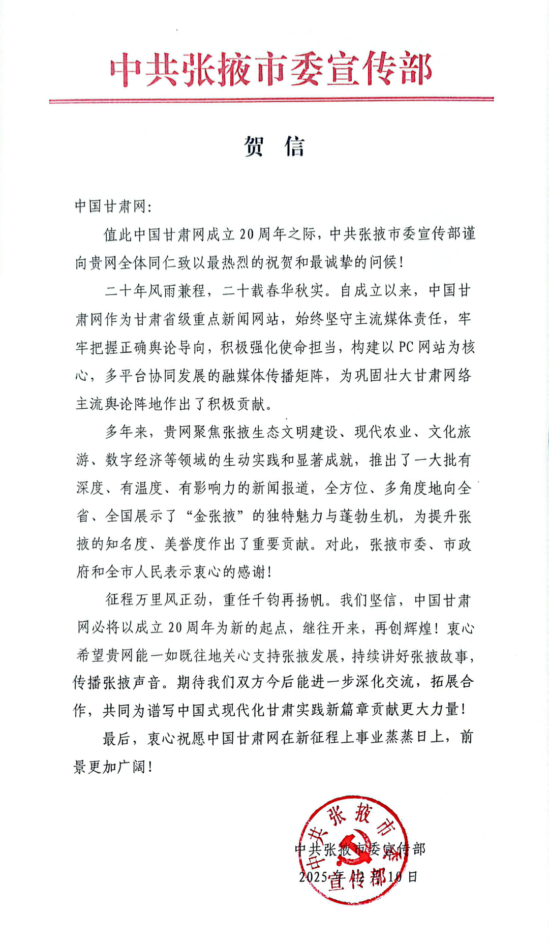 二十载·正青春丨张掖市委宣传部祝贺中国甘肃网成立20周年