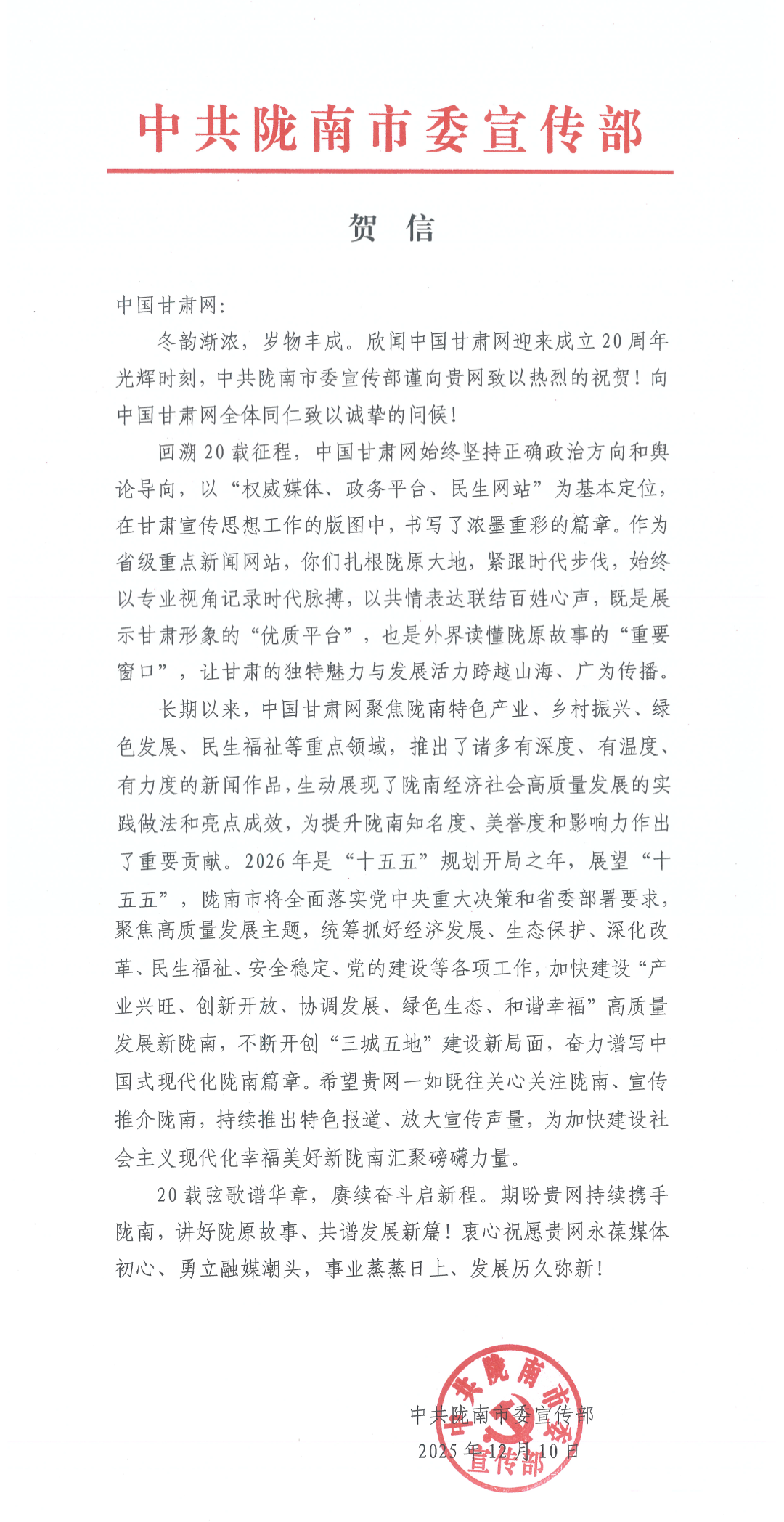 二十载·正青春丨陇南市委宣传部祝贺中国甘肃网成立20周年