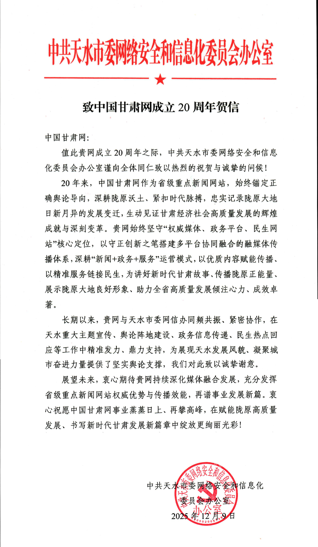 - 2025-12-22二十载·正青春丨天水市委宣传部祝贺中国甘肃网成立20周年