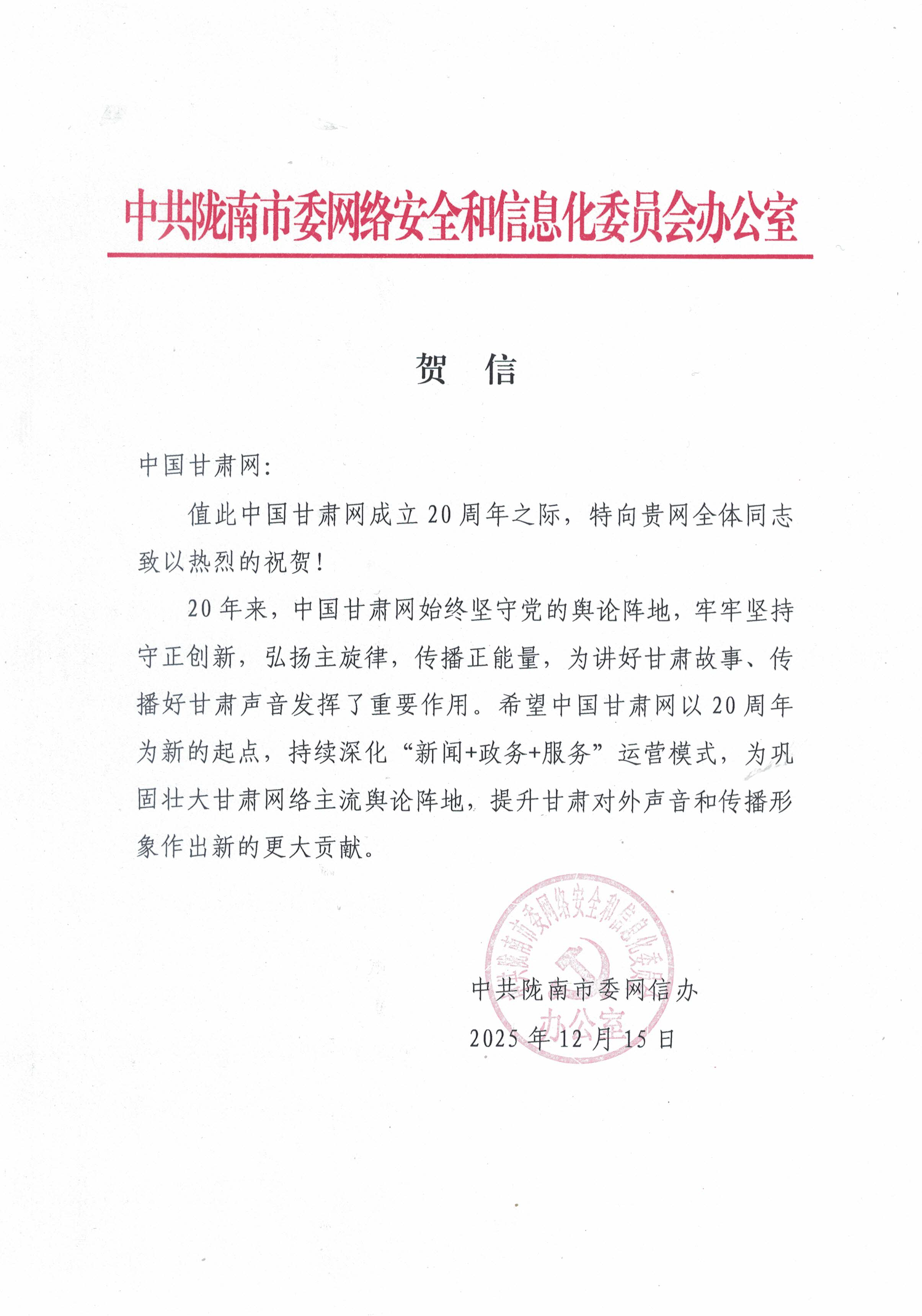 - 2025-12-22二十载·正青春丨陇南市委宣传部祝贺中国甘肃网成立20周年