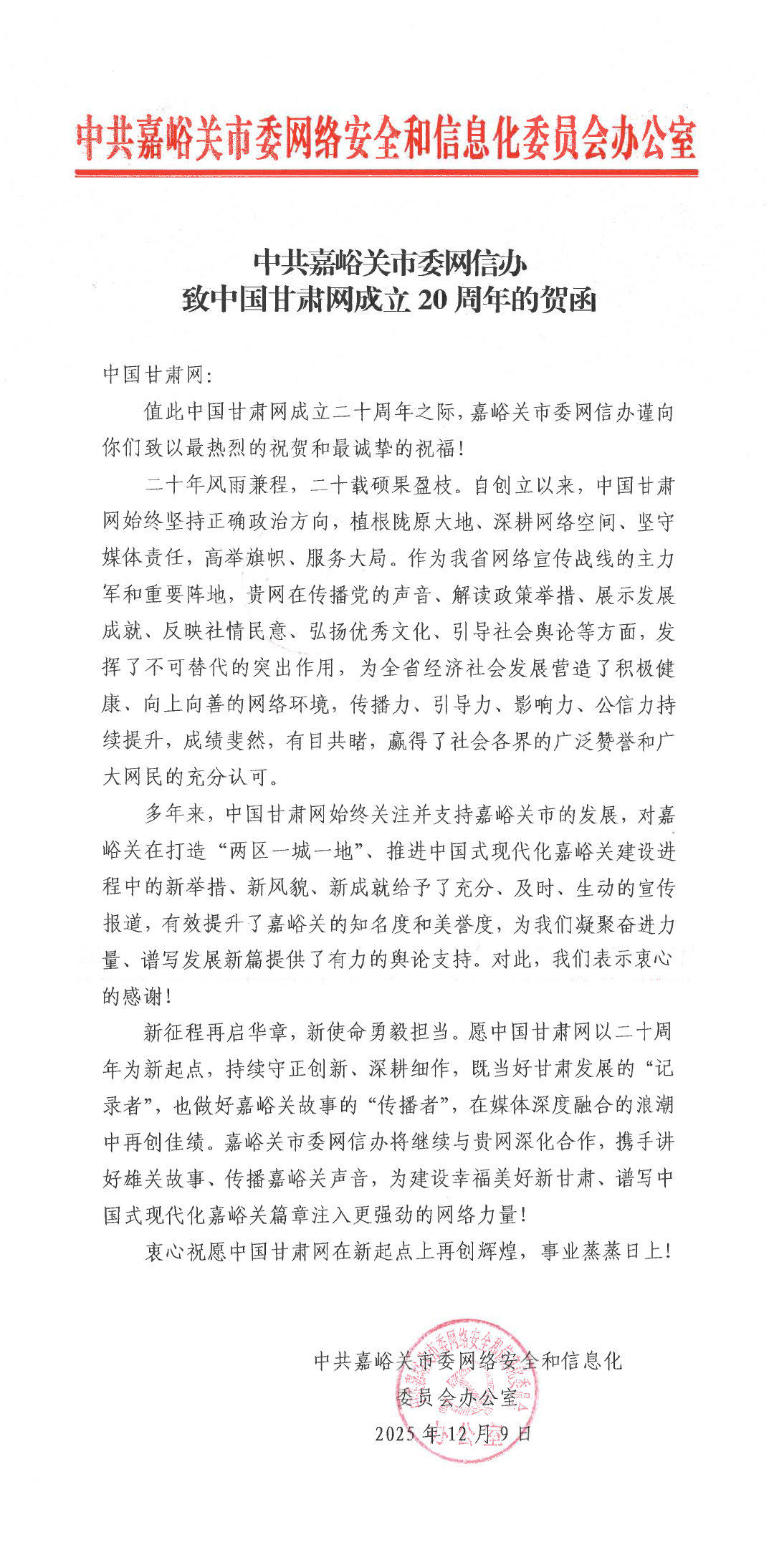 - 2025-12-22二十载·正青春丨嘉峪关市委宣传部祝贺中国甘肃网成立20周年