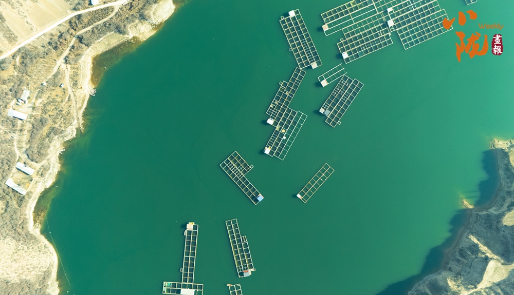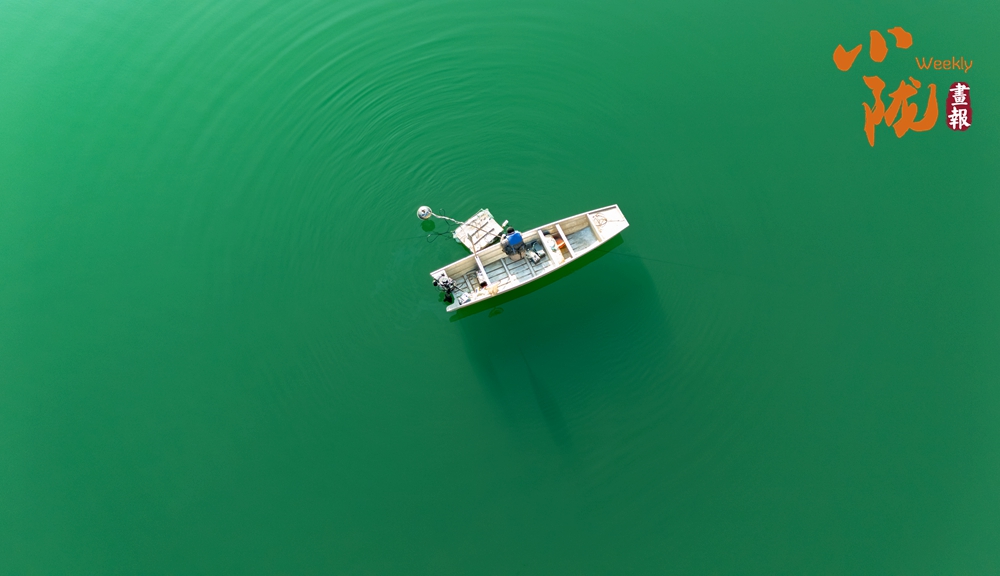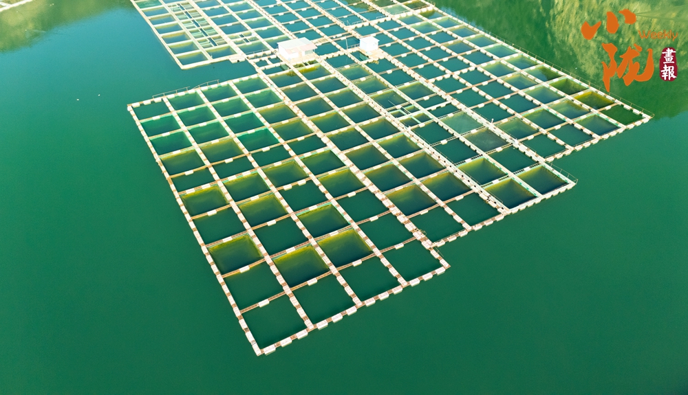 在这片湛蓝的湖水中,一方方网箱静静地泊着,如同水上阡陌,将广阔的湖面勾勒成丰饶的田园。