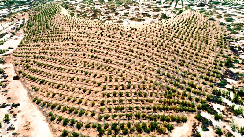 在腾格里沙漠西缘的沙咀墩治沙造林示范区,连绵沙丘上的草方格环环相扣,牢牢缚住黄沙。作为“十四五”时期“三北”工程科学绿化试点重点项目,这里已完成工程固沙造林5.5万亩。“我们因地制宜对流动沙丘、沙地和草地精准治理,让每一寸黄沙都能得到有效管控。”民勤县邓岔苗圃林业工程师叶文峰的话语中,满是自豪。