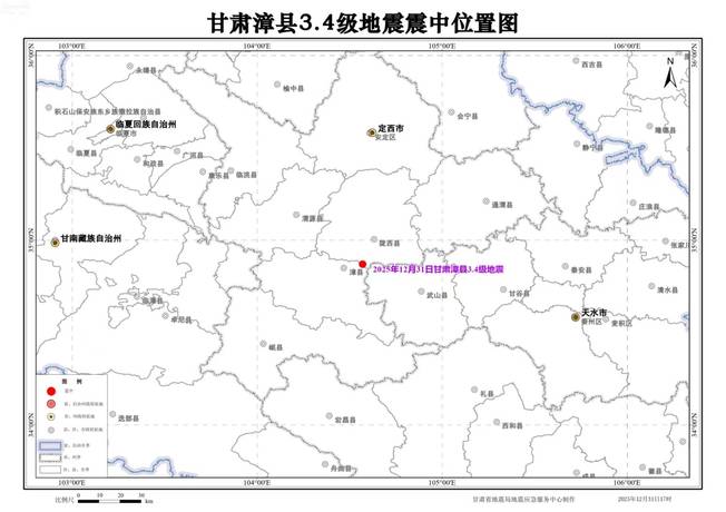 中国地震台网正式测定:12月31日17时03分在甘肃定西市漳县(北纬34.87度,东经104.57度)发生3.4级地震,震源深度13千米。