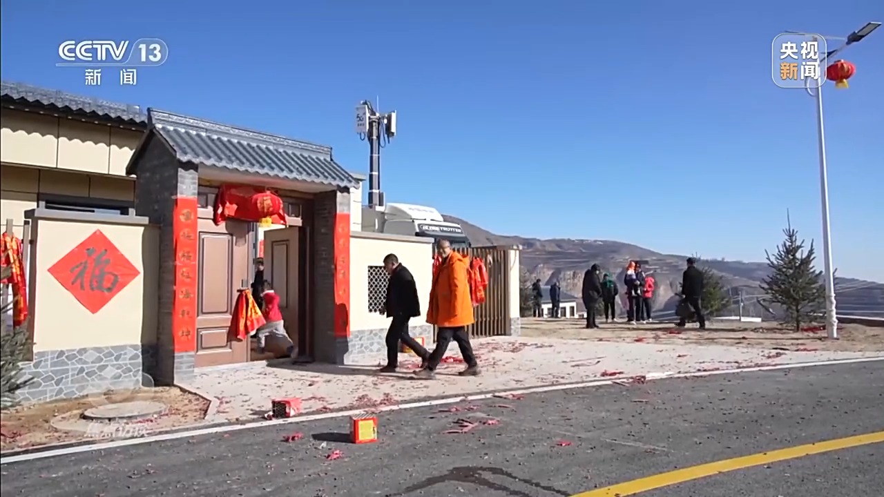 前来道贺的亲朋好友络绎不绝。按照当地搬新家的习俗,他们在张正壮家门口放鞭炮,挂红布。家里还没有完全收拾好,亲友们帮着一起安窗帘、挂上画。