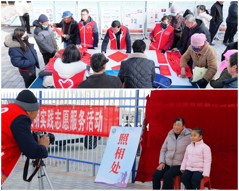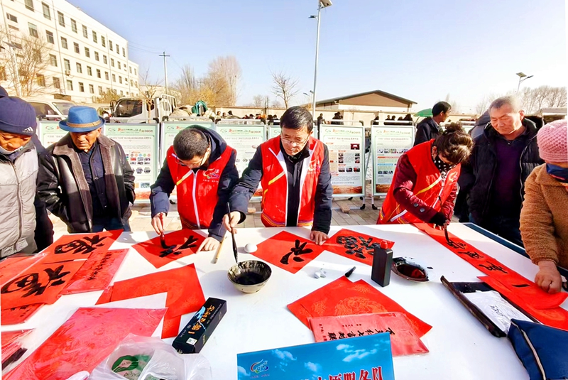 “骏马临门添福气,春风入户送安康”“天增岁月人增寿,春满人间福满门”……活动现场墨香四溢,枣乡文艺志愿者顺着熙熙攘攘的人群来回穿梭,宛如一片欢腾的红色海洋。“我为乡亲送祝福”展台前人头攒动,一副副春联、一张张“福”字在志愿者手中纷飞,笔走龙蛇般的技法行云流水,书写递送工序流畅、热度高涨,“市场”青睐供不应求,“回头客”们赞誉有加,把浓浓的墨香和暖心的祝福传到了家家户户。