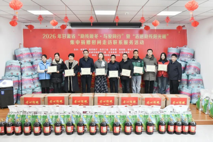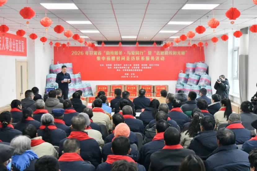 1月20日,2026年甘肃省“助残暖冬·与爱同行”暨“志愿助残阳光暖”集中捐赠慰问走访联系服务活动在武威市古浪县残疾人日间照料服务省级示范中心举行。武威市、古浪县政府领导,省市县残联、民政、工会、团委、妇联、红十字会等部门单位负责同志,省助残志愿者协会、爱心企业、助残志愿者及受赠残疾人代表等150多人齐聚一堂,感受党和政府送来的暖冬关爱。