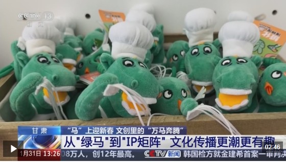 总台记者 王妍:它就是铜奔马的绒化文创——“绿马”,因“丑萌”而出圈。今年是马年,它也拥有了限定版的新春皮肤。你看,通体正红的“红运当头马”、身穿红色针织毛衣的“本命年马”,它们都是甘博今年“马力全开”系列贺岁新品。有没有哪一只戳中你的心啊?
