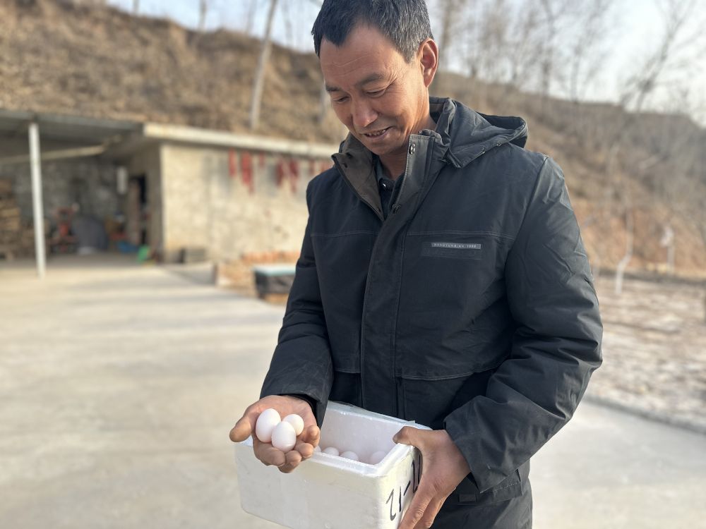 甘肃省积石山保安族东乡族撒拉族自治县柳沟乡张郭家村村民安明强向记者展示鸽蛋(1月26日摄)。新华社记者 张文静 摄