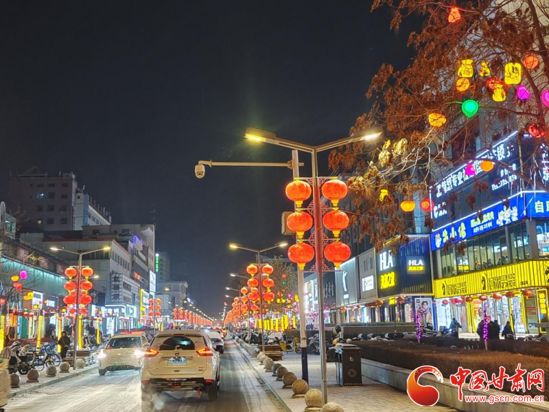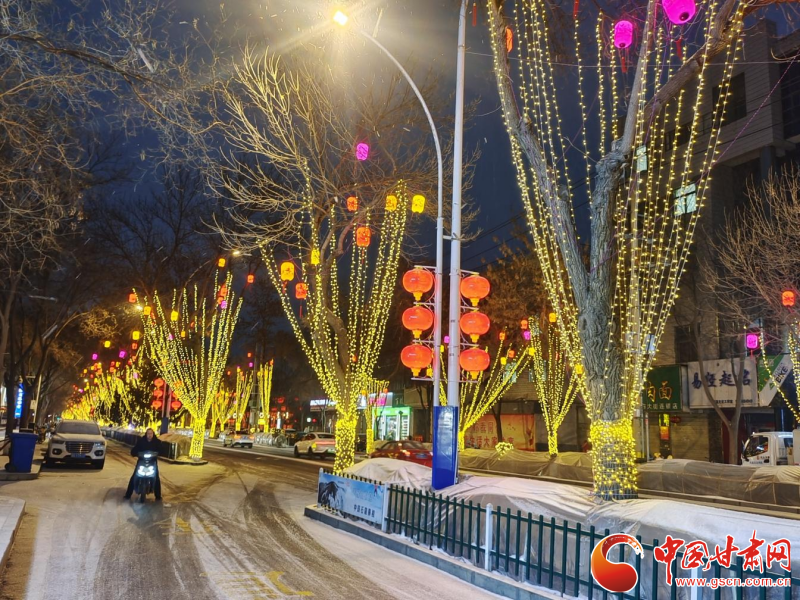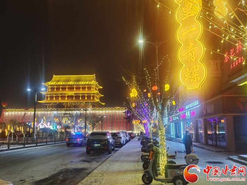 此次降雪恰逢春节前夕,武威城区大街小巷张灯结彩,红灯笼、中国结与洁白的雪花相互映衬,呈现出“火树银花合,星桥铁锁开”的诗意景象。夜幕降临,城区主干道、广场及景区的灯光次第亮起,暖黄色的灯光透过纷扬的雪花,折射出柔和而梦幻的光晕,整个城市仿佛置身于童话世界。