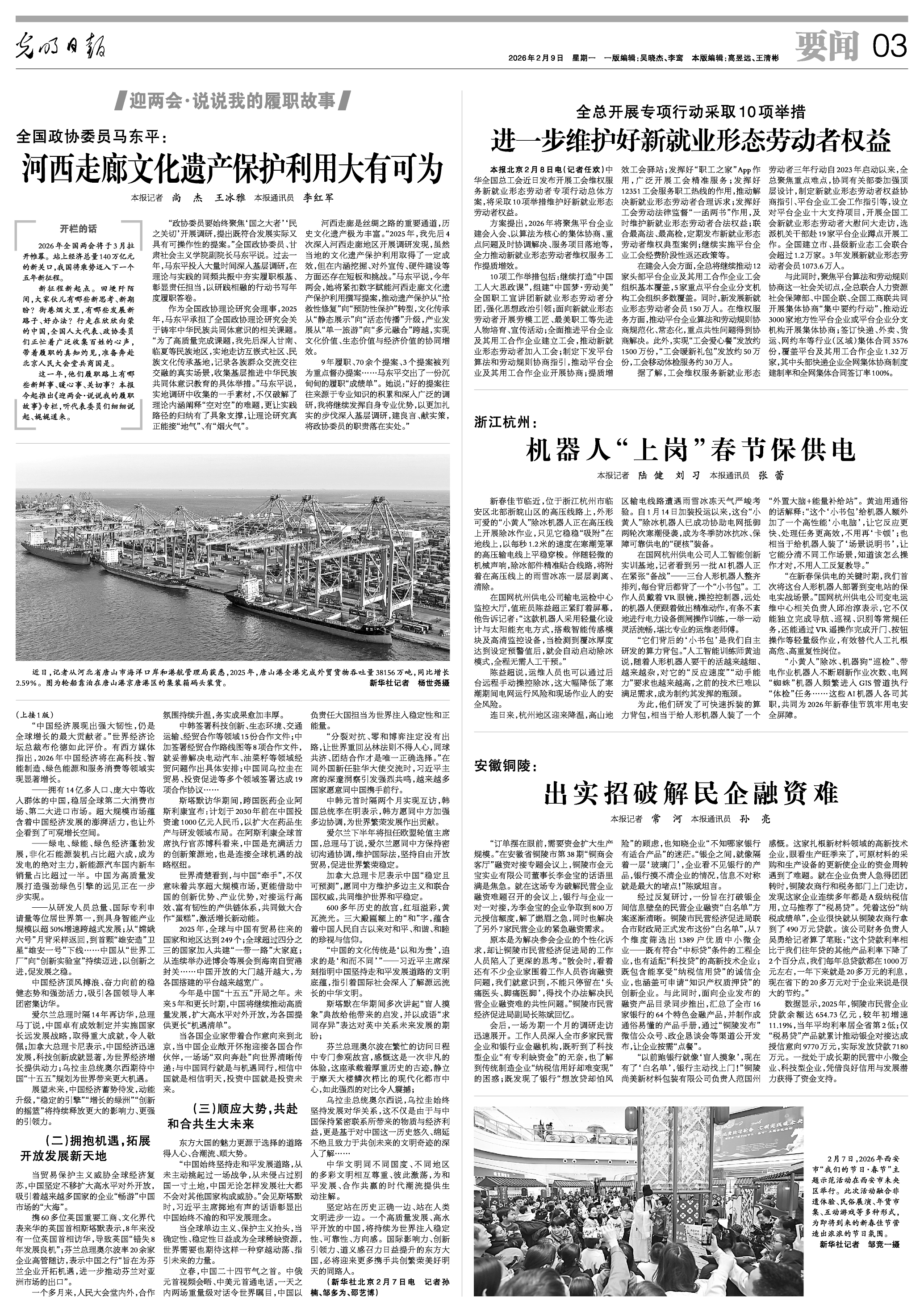 河西走廊是丝绸之路的重要通道,历史文化遗产极为丰富。“2025年,我先后4次深入河西走廊地区开展调研发现,虽然当地的文化遗产保护利用取得了一定成效,但在内涵挖掘、对外宣传、硬件建设等方面还存在短板和挑战。”马东平说,今年两会,她将紧扣数字赋能河西走廊文化遗产保护利用撰写提案,推动遗产保护从“抢救性修复”向“预防性保护”转型,文化传承从“静态展示”向“活态传播”升级,产业发展从“单一旅游”向“多元融合”跨越,实现文化价值、生态价值与经济价值的协同增效。