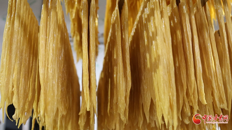 走进车间内,多条标准化生产线整齐排布,工人们身着洁净工装、规范佩戴防护装备,巧手翻飞间,凝结的豆膜被利落挑起,整齐晾挂在支架上,淡金色的豆膜垂落舒展。