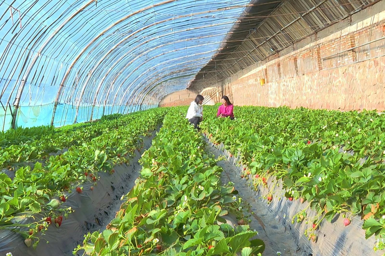 设施种植既守护“菜篮子”刚需,也点亮“果盘子”甜蜜。相邻的草莓大棚内,翠绿藤蔓间,红润饱满的草莓缀满枝头,临近春节销量持续攀升,既有上门采摘的顾客,也有商超订单,成为种植户的增收新增长点。