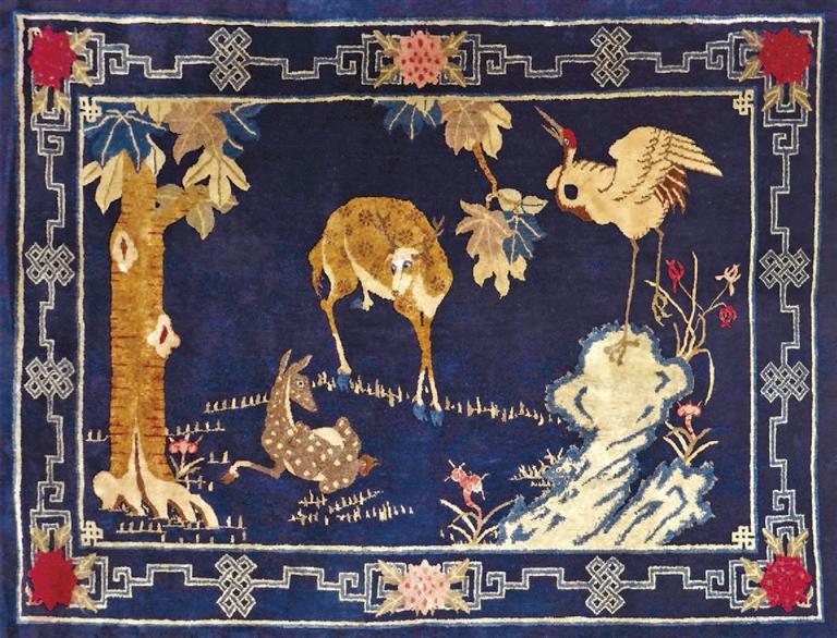 韩丛礼介绍,这方宫毯采用天然矿物质颜料染色,“百年不褪色,千年仍鲜亮,就像敦煌壁画一样,这是老祖宗的智慧。”这方宫毯还有一段特殊的来历,它本是清代后宫水房用毯,与另一方带有“后宫水房”题字的古毯为一对。“题字款被其他藏家收走了,我得知后赶紧把这方无款的收了下来。”韩丛礼说,虽少了四个字,但宫毯的工艺、花纹与题字款一模一样,羊绒材质和矿物颜料染色,都是清代宫毯的典型特征。宫毯上,鹤鹿相依的图案寓意吉祥,线条流畅、色彩和谐,“当时能织出这样的图案,工匠的技艺堪比专业画家。”如今,这方宫毯与其他古毯一起,被韩丛礼悉心收纳,每当展开观赏,都能感受到清代宫廷生活的雅致与韵味。