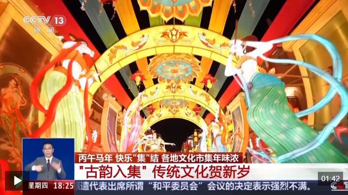 在甘肃,敦煌新春文化市集上,1200余件承载着丝路文化特色的花灯,点亮了新春的夜空。造型取材于反弹琵琶、三兔共耳等敦煌壁画经典意象,融入灯组设计。大家身着汉服,赏花灯,踢毽子,感受博大精深的中华传统文化。