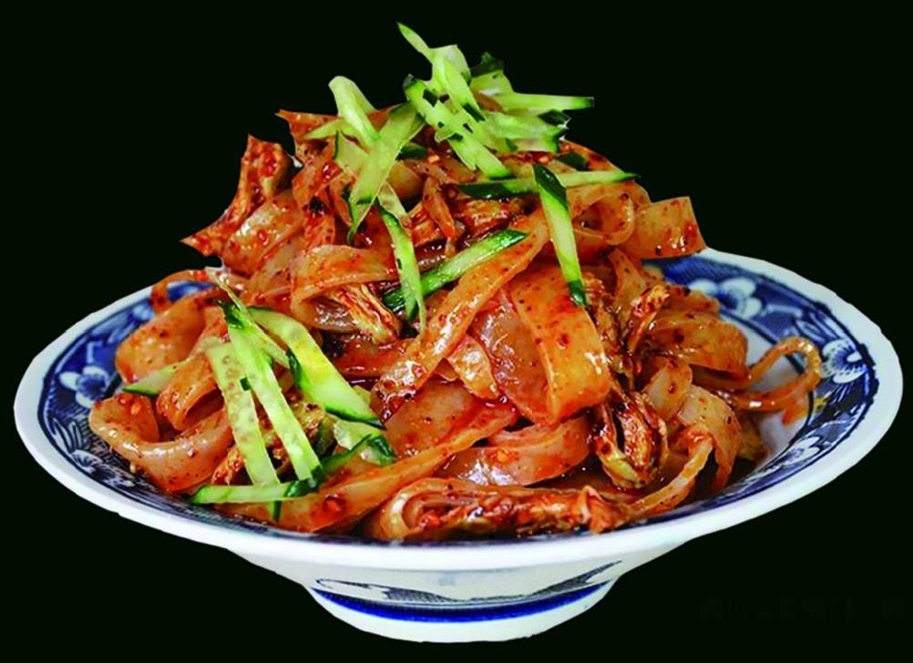 酿皮,外地人一般称为凉皮,其“家族成员”有陕西宝鸡岐山擀面皮、陕西秦镇以大米为原料的米面皮等。武山酿皮颜色黄亮,精柔可口,吃法讲究。调料位油泼辣子、蒜泥芥末、精盐、香醋、酱油等,再加上几片面筋和一小撮淖熟的绿豆芽、菠菜、胡萝卜丝之类的青菜,顿时五色纷呈,色香味美,凉爽润滑。