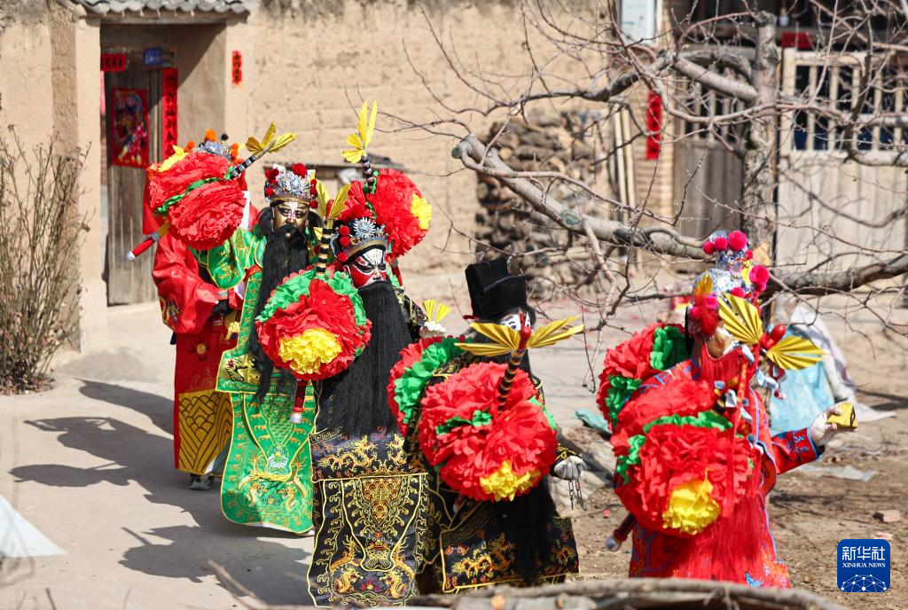 2月21日,在甘肃省静宁县仁大镇,社火队员走家串户表演。新华社发(侯崇慧摄)