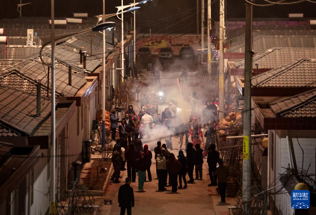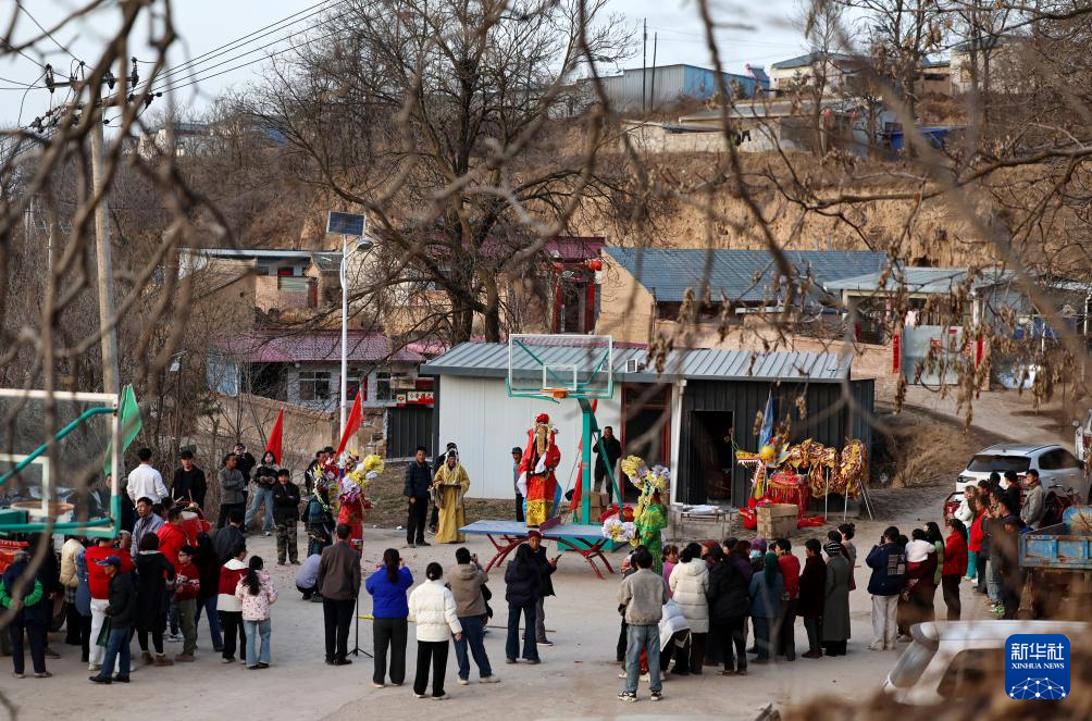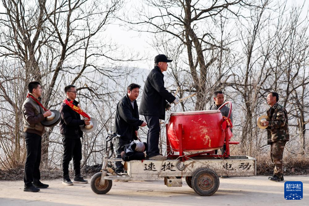 2月21日,在甘肃省静宁县贾河乡侯山村,村民在敲锣打鼓。新华社发(侯崇慧摄)