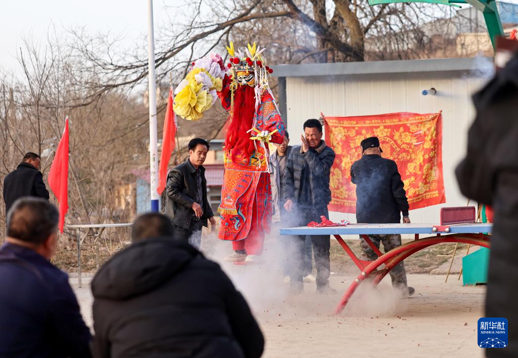 2月21日,在甘肃省静宁县贾河乡侯山村,社火队员在表演。新华社发(侯崇慧摄)