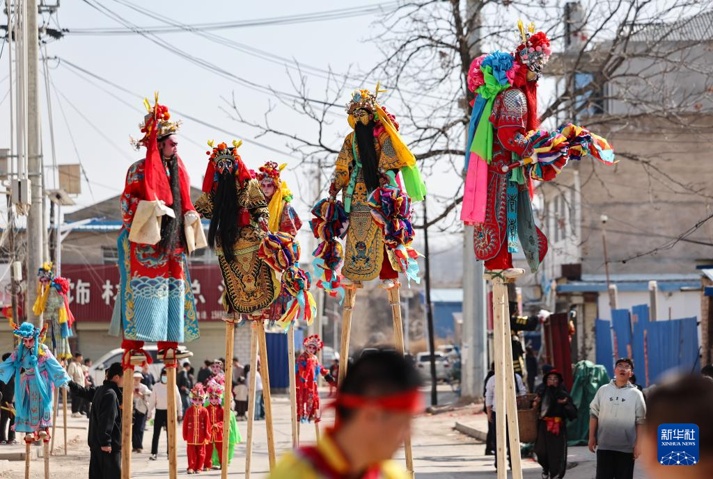 2月21日,在甘肃省静宁县李店镇五方河村,社火队员在表演踩高跷。新华社发(侯崇慧摄)