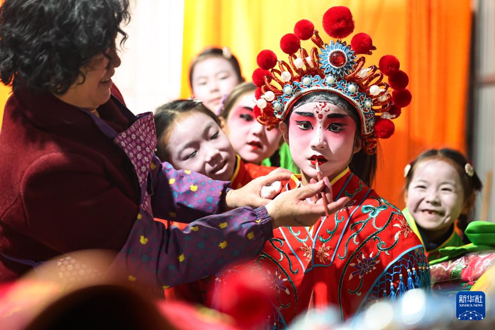 2月21日,在甘肃省静宁县李店镇五方河村,社火队员在为表演做准备。新华社发(侯崇慧摄)