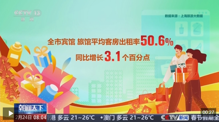 据上海旅游大数据监测,今年春节假期,上海共接待游客2167.21万人次,同比增长8.36%;涵盖吃、住、行、游、购、娱等全要素的旅游消费交易总金额达256.14亿元,同比增长20.9%。全市宾馆、旅馆平均客房出租率为50.6%,同比增长3.1个百分点。
