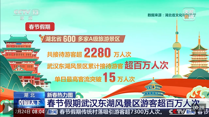 湖北省文化和旅游厅数据显示,春节假期湖北省600多家A级旅游景区共接待游客超2280万人次。其中武汉东湖风景区累计接待游客超百万人次,单日最高客流突破15万人次。此外,湖北各级博物馆、图书馆、文化馆陆续推出系列活动600余场,累计接待观众超300万人次。