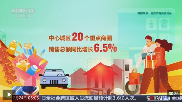 重庆市商务委员会消息,春节假期重庆围绕“购在中国·爱尚重庆”主题,聚焦“吃、住、行、游、购、娱”六大元素,组织促消费活动2000余场。全市消费总额同比增长7.8%。其中商品零售额同比增长7.1%,服务零售额同比增长8.5%,夜间消费额同比增长7.9%。中心城区20个重点商圈销售总额同比增长6.5%,消费市场实现新春“开门红”。