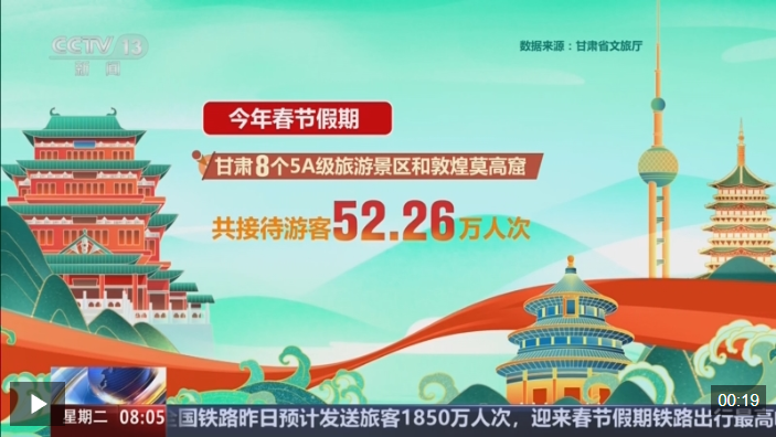 记者从甘肃省文旅厅了解到,今年春节假期全省8个5A级旅游景区和敦煌莫高窟共接待游客52.26万人次。交通出行热度持续攀升,国铁兰州局通报,昨天发送旅客42万人次,为春节假期最高峰。