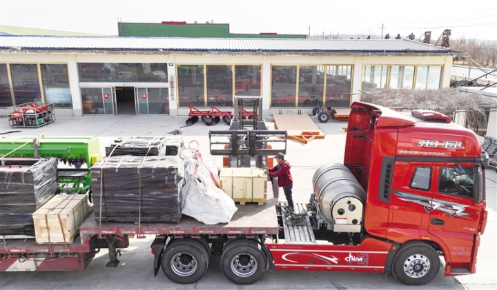 2月26日,金塔县四方装备制造有限公司的工人忙着装运农用机械设备,准备销往哈萨克斯坦。这是金塔县农用机械设备制造企业首次向中亚国家出口农机装备。