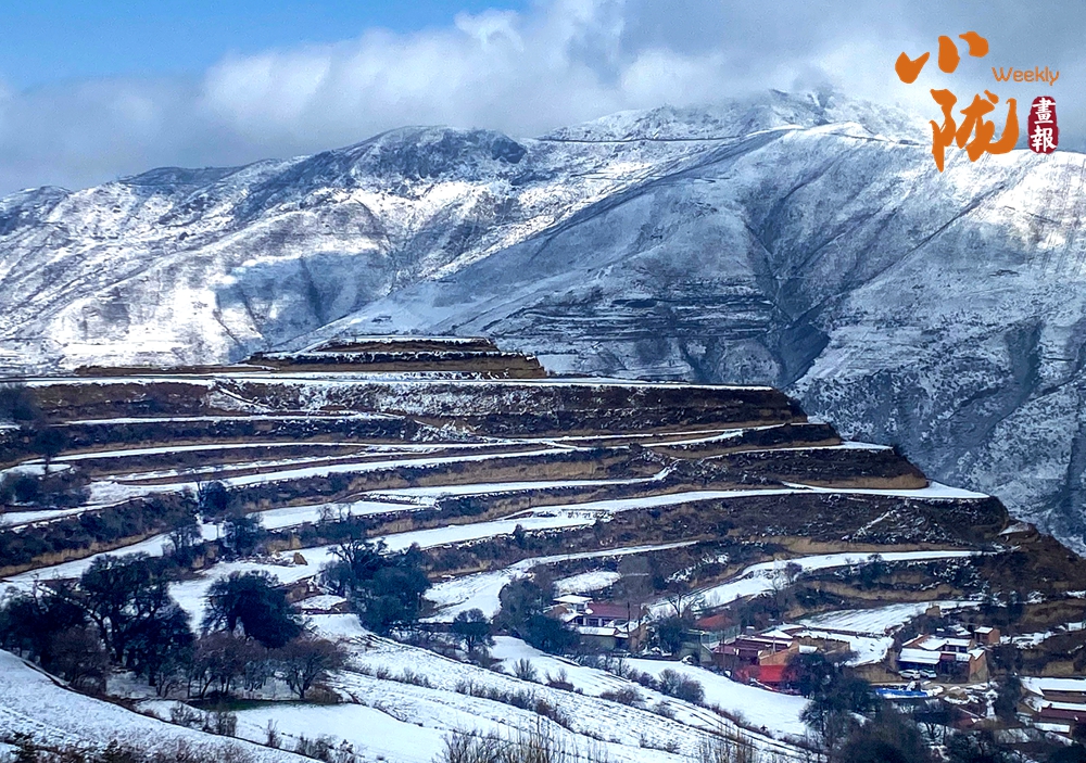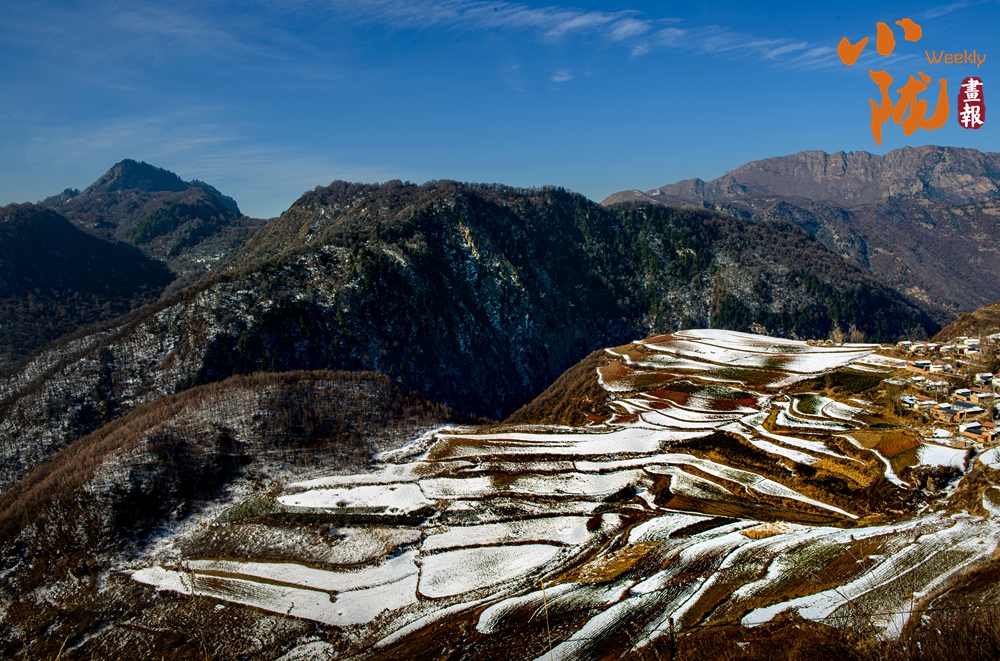 山腰梯田薄雪轻披,蜿蜒埂垄如银线游走,勾勒出大地的肌理。山脚村落里,红墙在雪色中晕染出暖意;料峭风过处,已藏着春芽欲破的萌动。