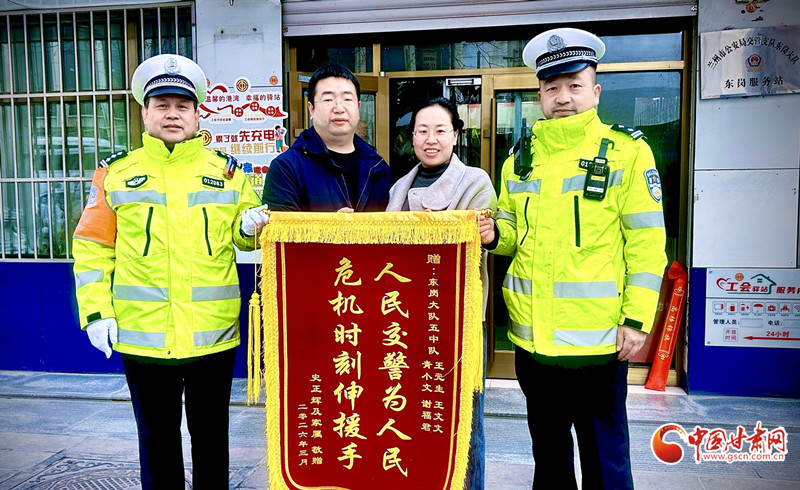 中国甘肃网3月16日讯(西北角·中国甘肃网记者 刘姗)3月16日,兰州市公安局交管支队东岗大队收到一份特殊礼物,史正辉及家属专程送来锦旗——“人民交警为人民 危机时刻伸援手”金色字样,饱含着对大队民辅警的满满谢意。