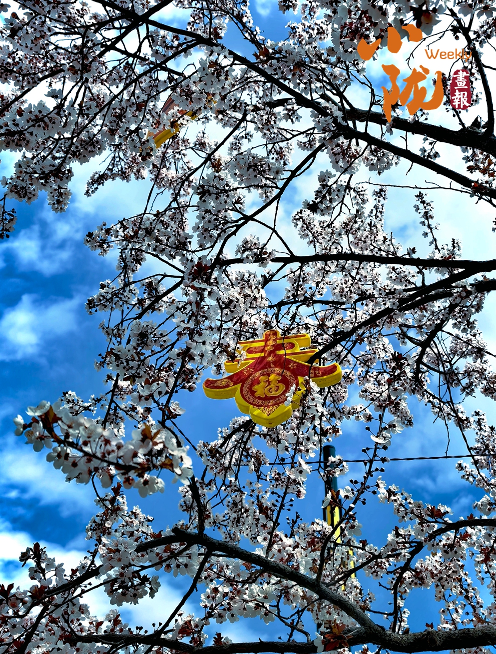 繁茂的樱花缀满枝头,洁白的花瓣在蓝天映衬下愈发清丽。枝桠间悬挂的“春福”挂饰,为春日街景添了暖意,风过处,落英缤纷,满眼浪漫与祥和。