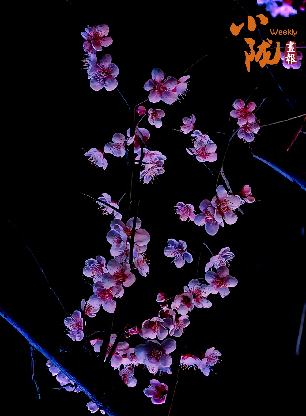 粉白梅花缀满枝桠在深色背景的映衬下,花瓣柔粉轻透,花蕊点点橙红,疏朗的枝条托着簇簇花影,为静谧的街巷流淌出清雅而坚韧的春日情致。
