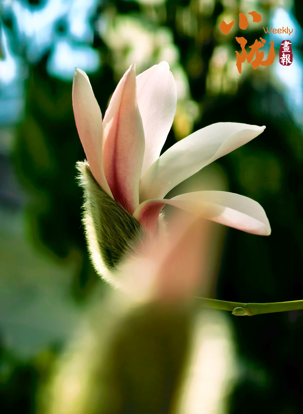 玉兰花悄然绽放,花瓣外白内粉,姿态温婉,花萼上细密的绒毛透着春日的鲜活,一树清新花影,尽显高洁雅致。