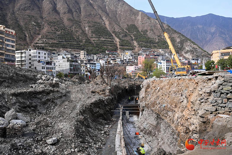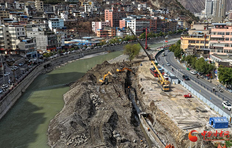 3月,阳光明媚,柳枝吐绿。甘肃文县城区白水江畔北滨河路的施工现场,一派繁忙景象。挖掘机挥臂挖土,吊车正在把钢模吊入10余米深的河床中,被焊接的钢筋火花四溅;抽水泵“突突”响着抽出河床里的积水;施工人员佩戴安全帽、身着工装,在工地来回忙碌,机械轰鸣声与指挥声交织在一起。