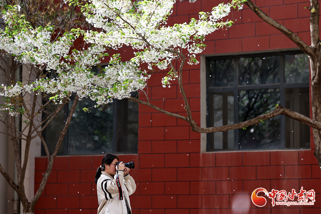 4月6日,摄影爱好者在甘肃兰州大学校园内拍摄樱花。