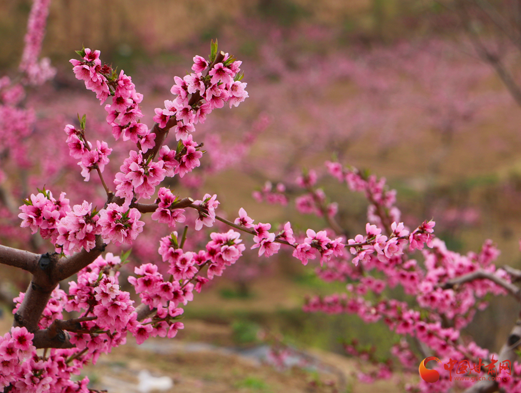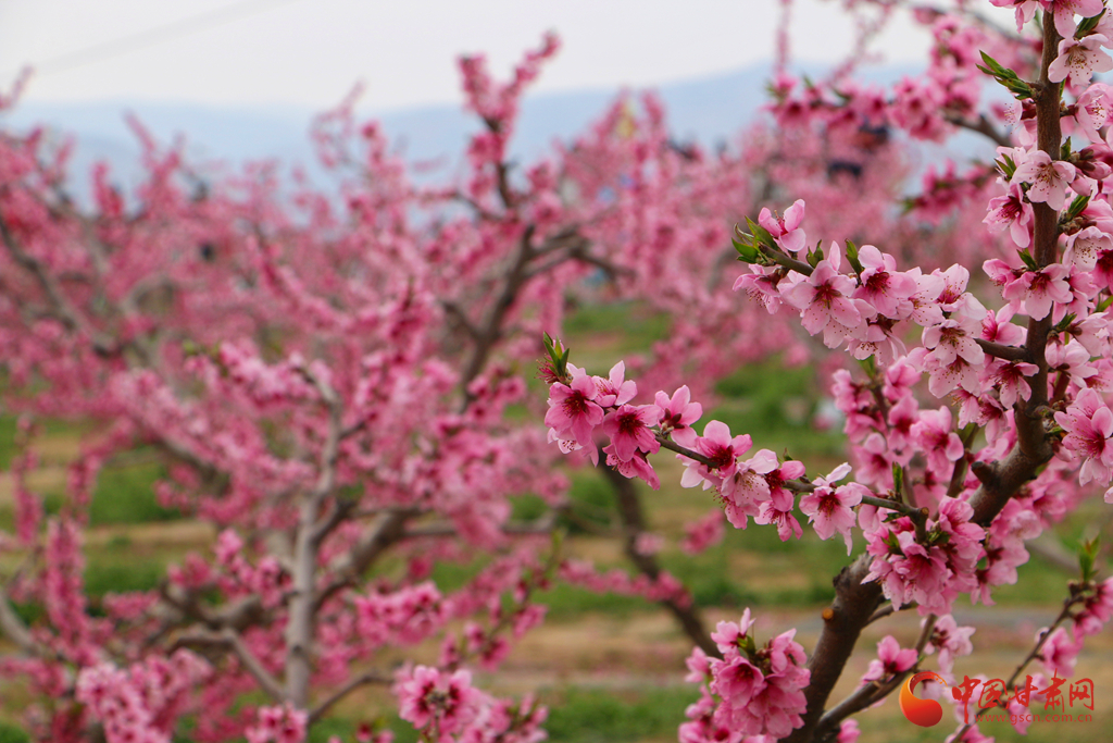 春风拂过,桃花竞相绽放,粉花满枝与远山交相辉映,宛如一幅诗意画卷。