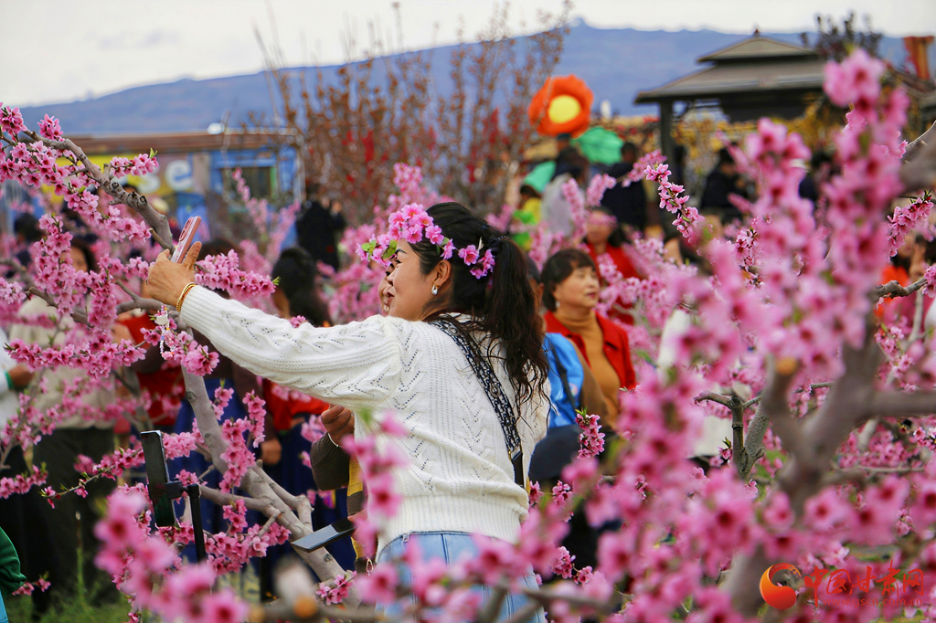 游客头戴花环,在花海中打卡留念,成为桃林里一道靓丽的风景线。