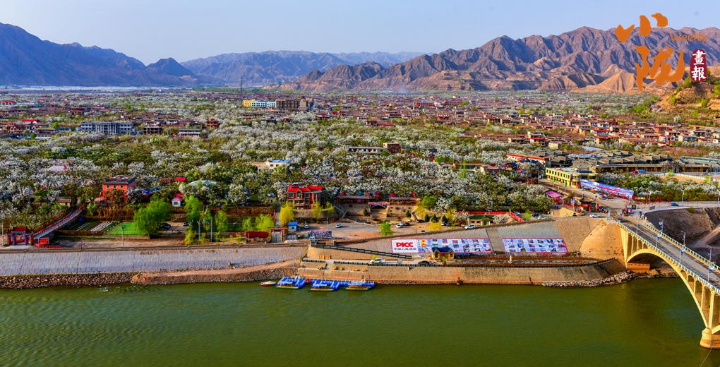 “忽如一夜春风来,千树万树梨花开。”黄河的臂弯里,万树梨花如雪似浪,漫覆河岸村落,与远处层叠山峦、粼粼河波相映,将古镇绘成诗意画卷。