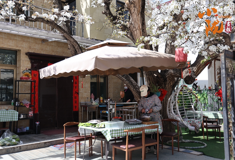 满树梨花覆院墙,暖阳轻洒小院。遮阳伞下烟火起,烟火人间春意长,寻常日子也藏着满满的温柔与暖香。
