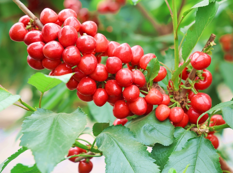 记者在棚内看到,成熟的樱桃挂在翠绿的枝叶间,红如玛瑙、紫若宝石,晶莹剔透,让人垂涎。据种植户介绍,今年樱桃坐果率高、品质上乘,口感脆甜多汁、果香浓郁,上市即备受市场青睐,这些都得益于标准化设施栽培与精细化管理,通过智能温室调控技术,实现了“寒冬开花、早春结果”,比露天樱桃提早近两个月上市。