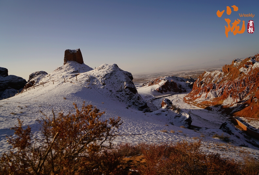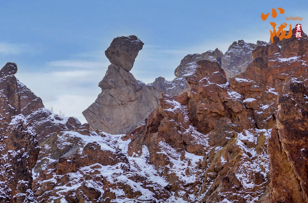 褐红岩壁覆着薄雪,群岩之间,那块形似巨龟探首的奇石格外醒目,它微微昂起头颅,仿佛正凝望远方的天际,身躯沉静而笃定,像大自然遗落的秘宝,苍茫中透着几分神秘。