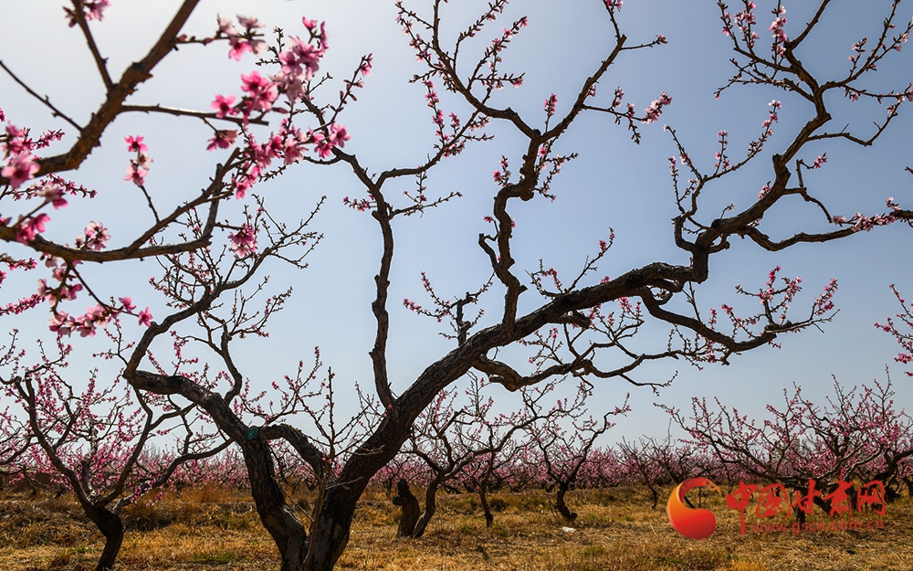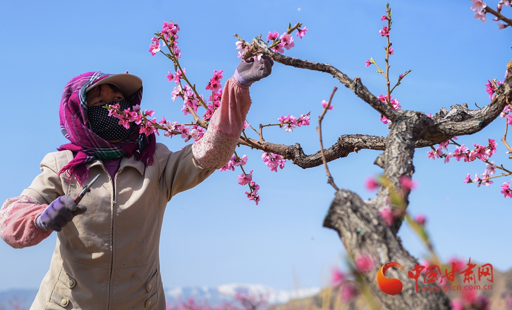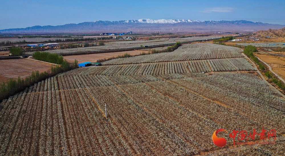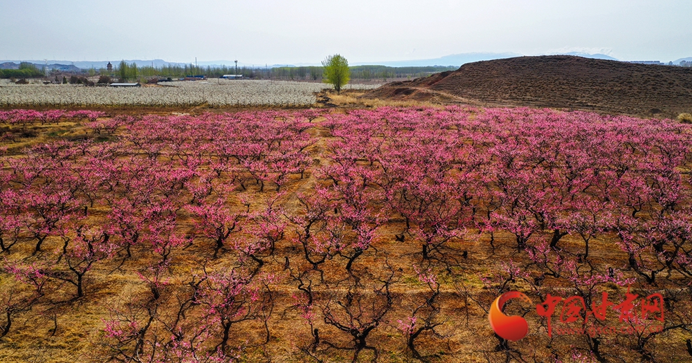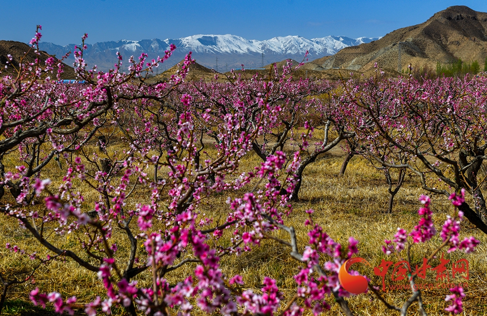 谷雨即将到来,景泰县猎虎山村境内的数百亩桃园花开正红,比邻的条山农场万亩梨园梨花正白。目光掠过桃园、梨园,远眺西南方的祁连山东端余脉寿鹿山,皑皑白雪覆盖山顶,青色的山峦环绕四周,三者同框犹如一场视觉盛宴,令人沉醉。