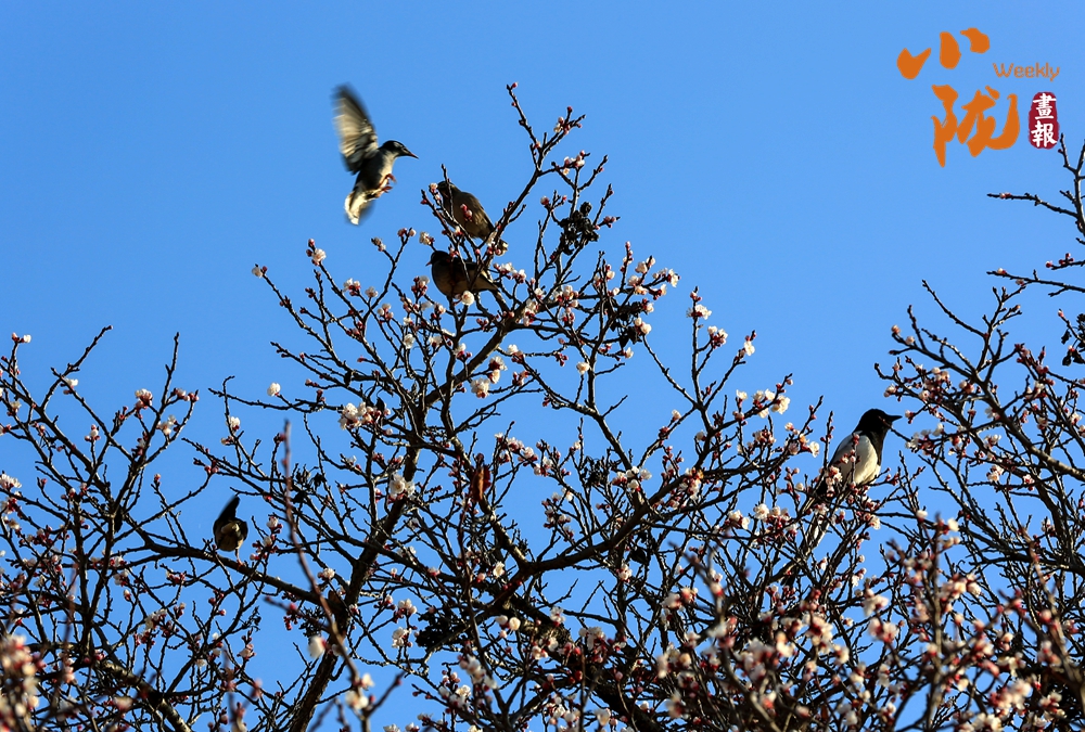 湛蓝如洗的天幕下,粉白杏花缀满枝桠,几只喜鹊或栖于枝头,或振翅欲飞。黑白羽色与柔嫩花色相映,灵动身影为春日添了鲜活意趣。